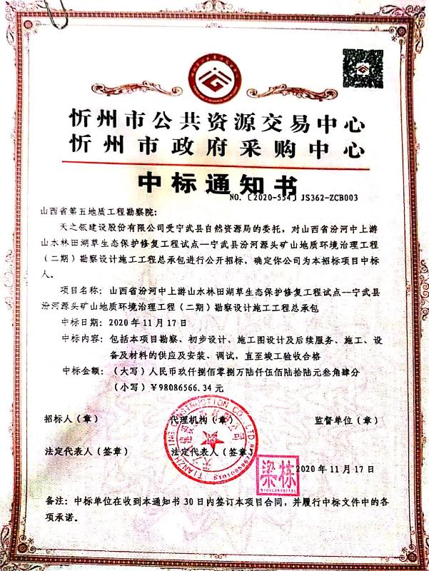 11月17日,五勘院成功中標(biāo)山西省汾河中上游山水林田湖草生態(tài)保護(hù)修復(fù)工程試點(diǎn)--寧武縣汾河源頭礦山地質(zhì)環(huán)境治理工程(二期)勘察設(shè)計(jì)施工工程總承包項(xiàng)目,合同額9808.66萬元。