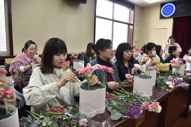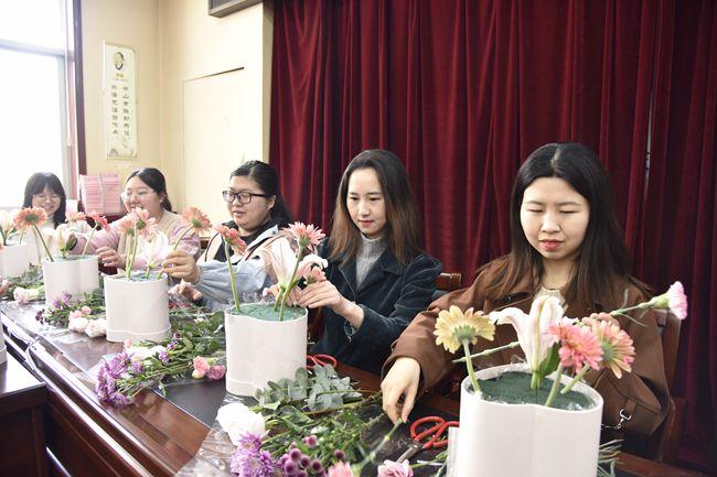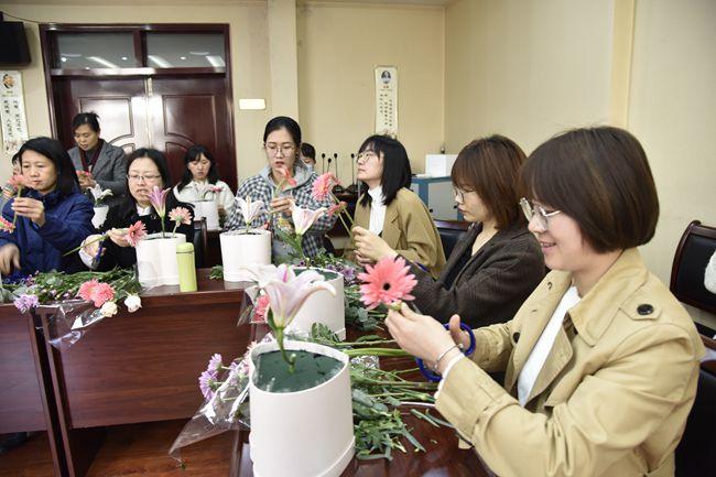 在老師的演示、指導(dǎo)下,大家將玫瑰、小雛菊、康乃馨等花朵進(jìn)行修枝剪葉,精心搭配,依照順序錯(cuò)落有致地插在一起,形成了一幅幅獨(dú)具匠心又飽含深意的插花作品。作品完成后,在場(chǎng)的女同志們紛紛與自己的鮮花作品合影留念,盡情享受著插花藝術(shù)的魅力和樂(lè)趣。