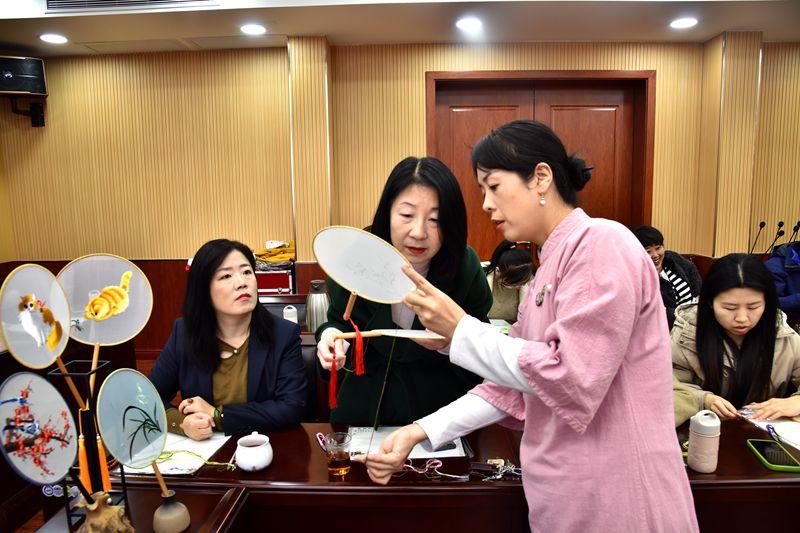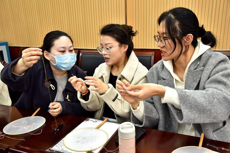 一針一線勾勒出人物花鳥,經(jīng)緯之間繡出錦繡山河?;顒蝇F(xiàn)場,堯都區(qū)非物質(zhì)文化遺產(chǎn)中心的平水繡老師將所帶工具一字排開,一個個精巧的團(tuán)扇瞬間吸睛,一團(tuán)團(tuán)色彩亮麗的繡線也讓人愛不釋手,女職工們也按耐不住好奇之心,躍躍欲試。