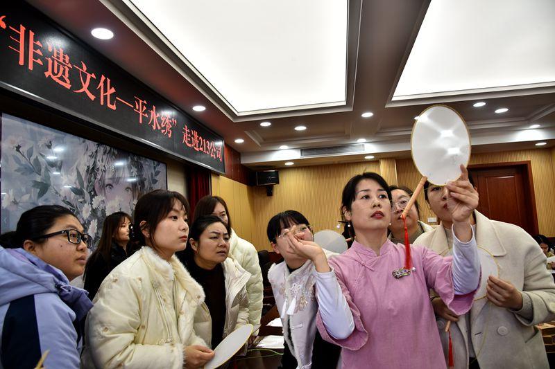 老師們從平水繡的歷史與文化娓娓道來,結(jié)合勾線、手法以及106種針法等技巧,將這項(xiàng)非遺技藝的魅力淋漓展現(xiàn)。“老師,我的手怎么不聽使喚?”“老師,這邊勾線多了一截怎么修補(bǔ)?”老師教得認(rèn)真,女職工們也學(xué)得仔細(xì)。